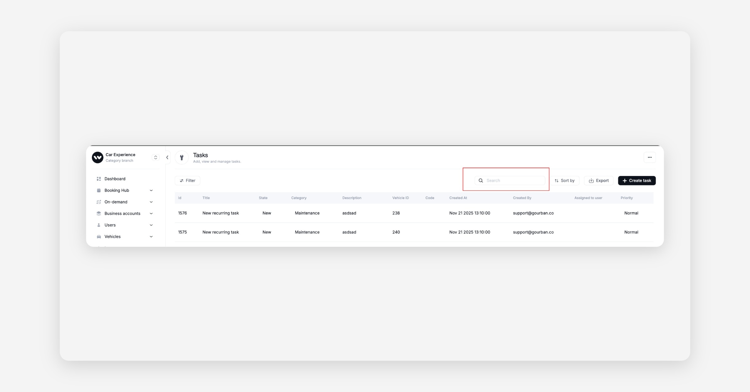Find records faster in the dashboard — and via API. In the dashboard, Bookings/Rentals search matches first+last name tokens and license plates, and Tasks/Damages lists support free‑text search; for integrations, GET /tasks and GET /damages include a searchText filter. This shortens on‑screen triage and enables precise server‑side filtering in external tools.