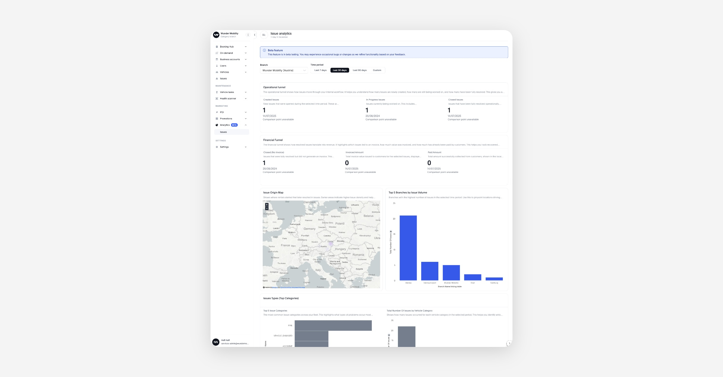 Wunder Analytics (Beta) now in the dashboard: The new Issues Analytics module adds KPI tiles, operational & financial funnels, an origin map, branch breakdowns, and top categories, so operators get a clear, self-serve view of workload, hotspots, and outcomes without manual exports.