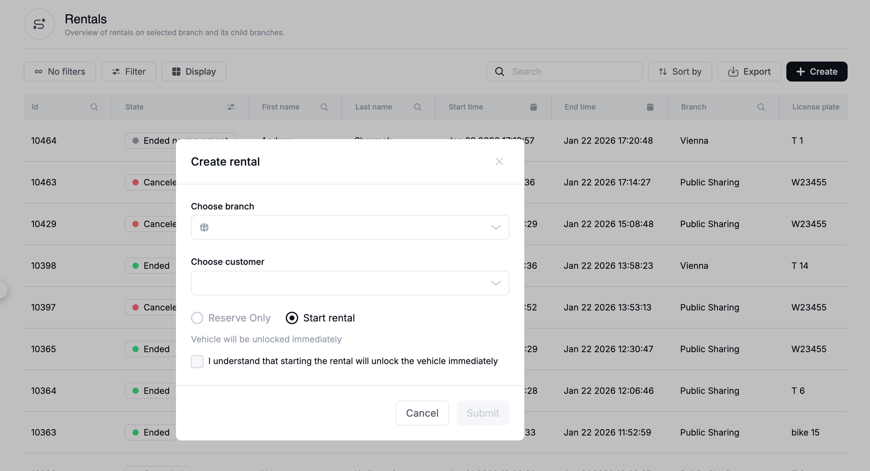 Dashboard Safety: Rental Unlock Warning: To prevent accidental vehicle unlocks, the "Create Rental" modal in the dashboard now displays a prominent warning. It explicitly clarifies that creating a rental immediately unlocks the vehicle, ensuring support agents verify the customer is physically at the car before proceeding.
