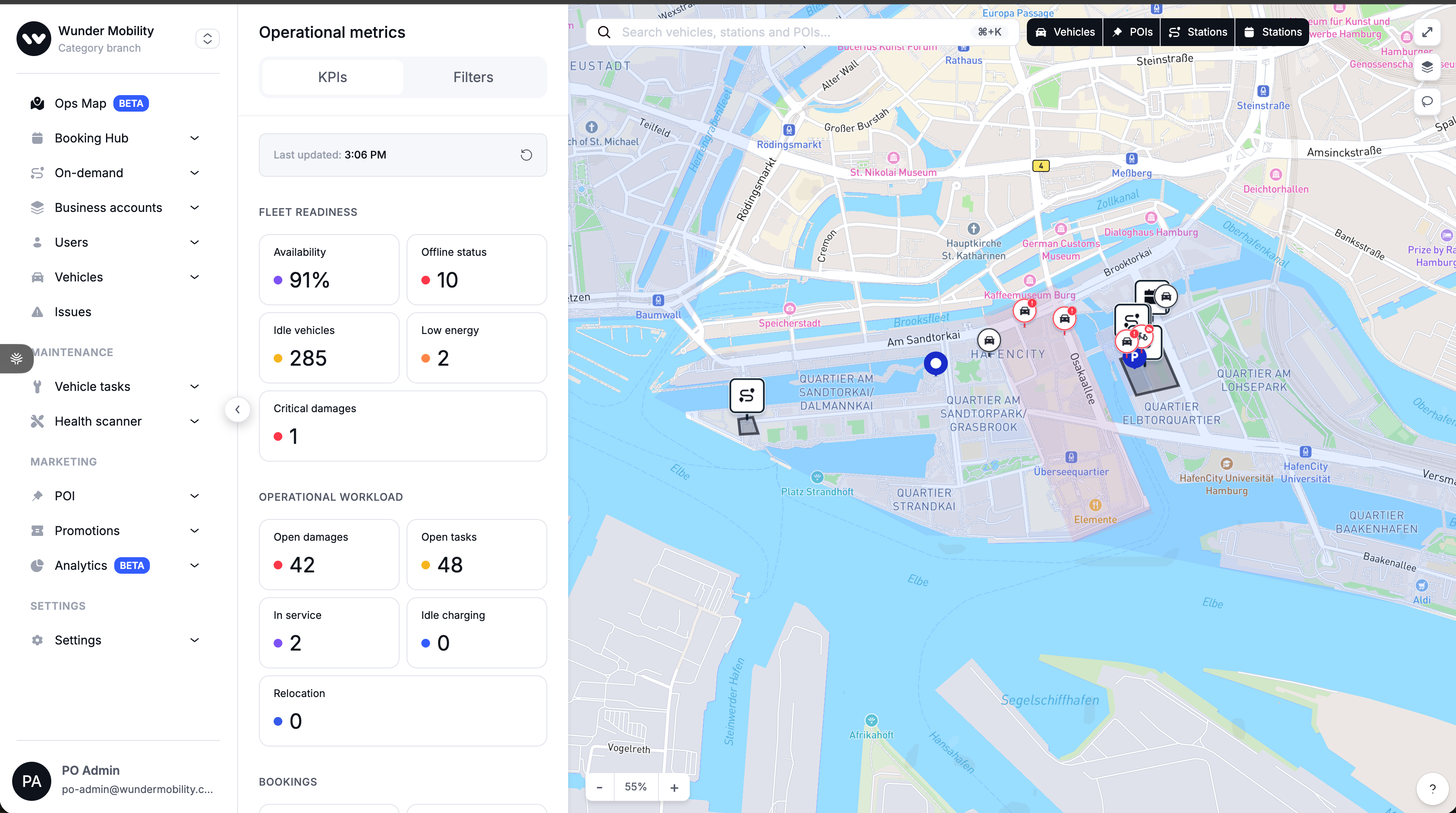 Unified Visibility: View your entire fleet, stations (pre-book & on-demand), and points of interest (POIs) on a single map. We've added a User Demand Heatmap layer that visualizes where users are opening the app in real-time (last 60 minutes), helping you identify hotspots and reposition vehicles effectively.